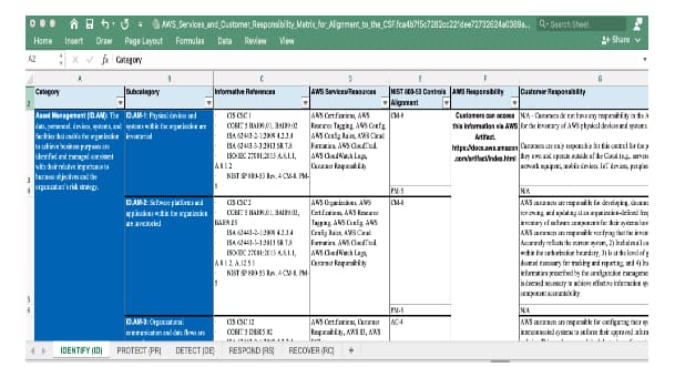 - Amazon. (2019, Jan.). NIST Cybersecurity Framework (CSF), Aligning to the NIST CSF in the AWS Cloud, Appendix A – AWS Services and Customer Responsibility Matrix for Alignment to the CSF, p.3. Amazon Web Services, Inc. Retrieved February 18, 2021 from: https://d1.awsstatic.com/whitepapers/compliance/AWS_Services_and_Customer_Responsibility_Matrix_for_Alignment_to_the_CSF.fca4b7f5c7282cc221dee72732624a0389aa2596.xlsx